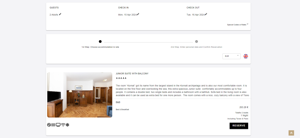 As you can see below, the room reservation page powered by WebBookingPro is seamlessly integrated into the website, thus ensuring that the hotel brand image remains consistent.