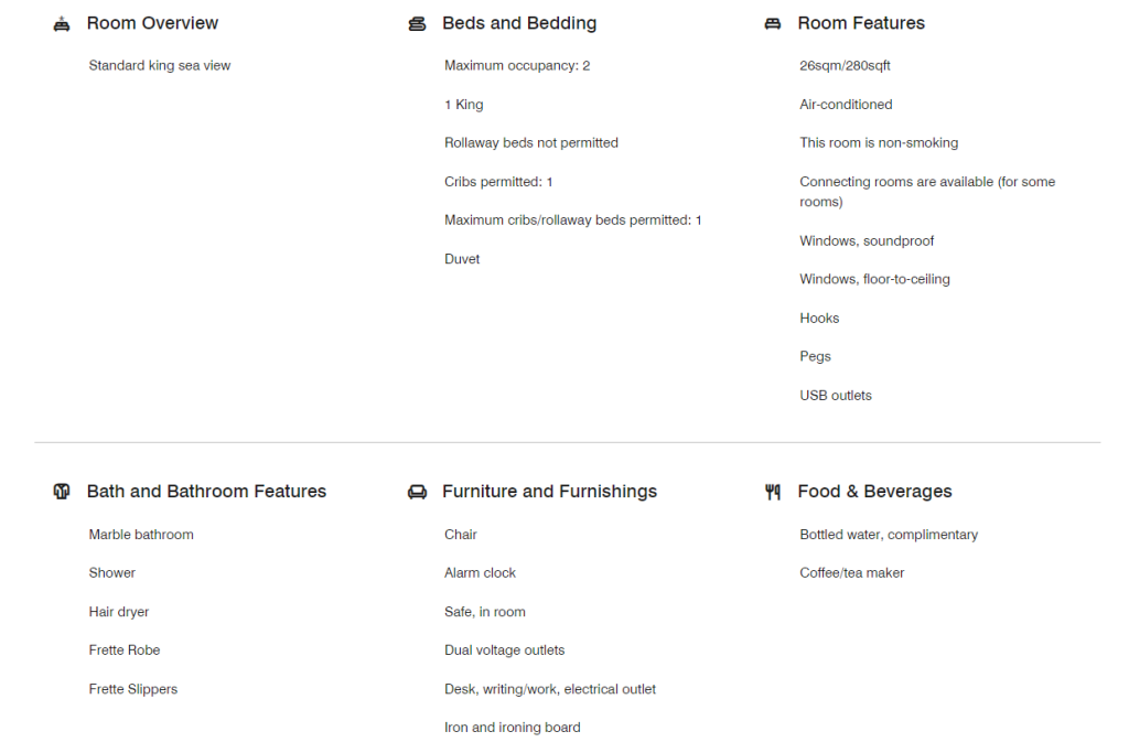 AC Hotel in Split provides a clear overview of room amenities by dividing them into categories, making it easier for potential guests to check whether the hotel offers everything they need.