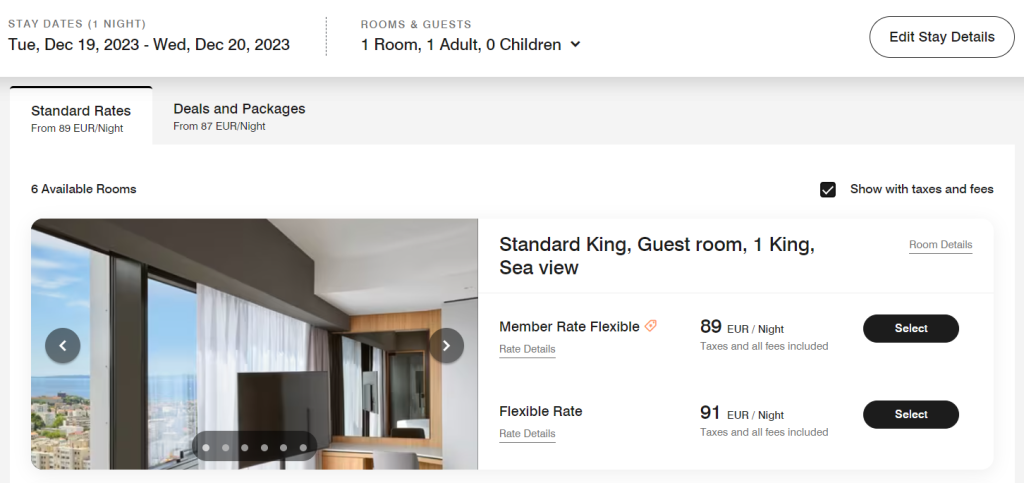 As you can see below, they list some basic information about the room, its price per night, as well as clearly state that all taxes and fees are included.