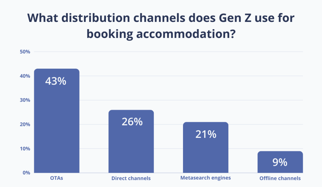 For instance, according to a study on Gen Z travelers conducted by the European Travel Commission, 43% of them rely on OTAs when booking their accommodation, whereas 26% prefer to book through direct channels.