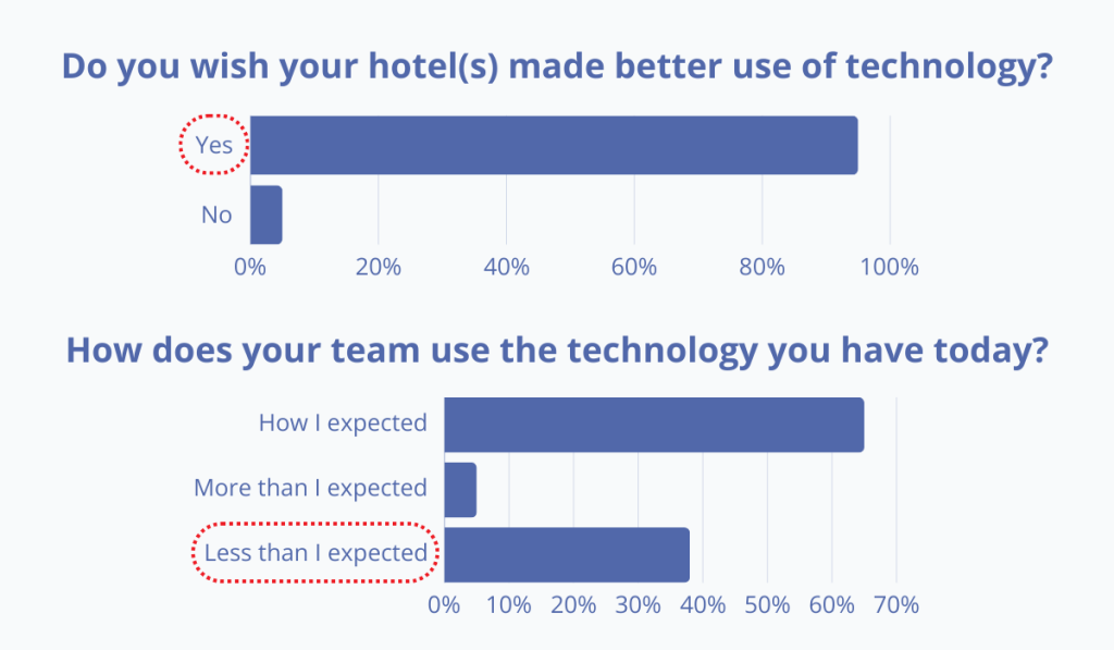 Namely, according to the 2022 Hotel Technology Survey, over 90% of hoteliers wish their properties made better use of technology, and almost 40% state that their staff uses the existing technology less than expected.