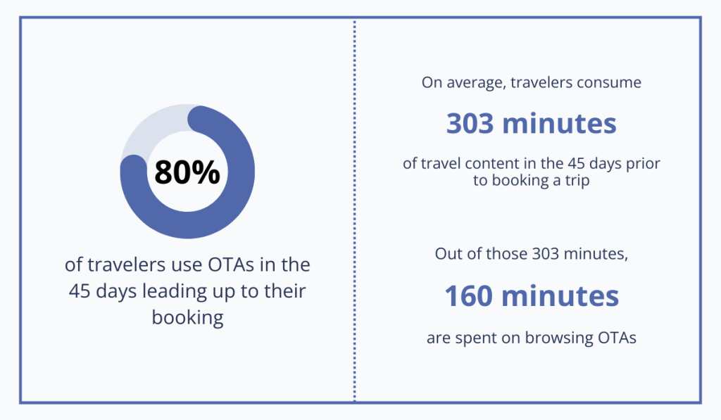 In fact, travelers dedicate the most time to OTAs, spending an average of 160 minutes on these platforms in the 45 days leading up to their trip, underscoring the considerable influence they have on the travel landscape and, consequently, the hospitality industry.