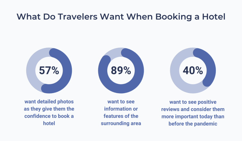For example, another survey conducted by Expedia Group reveals that people pay a lot of attention to the surrounding area, want detailed photos, and look for positive reviews when searching for accommodation.