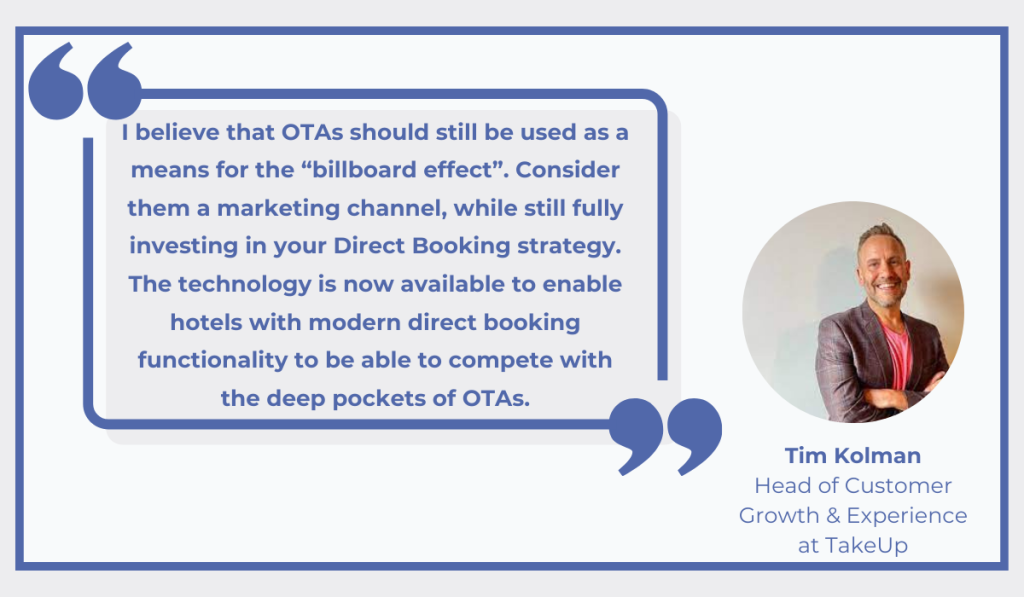 Tim Kolman, experienced hotelier and head of customer experience at TakeUp software, suggests that while OTAs can be a useful part of your marketing efforts, investing in a direct booking process is still a must for any hotel.