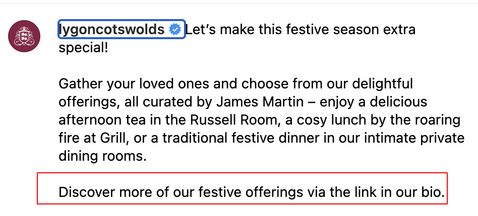 The Lygon Arms Hotel paired a photo on their feed with an informative and inviting caption that directs people to book a room.