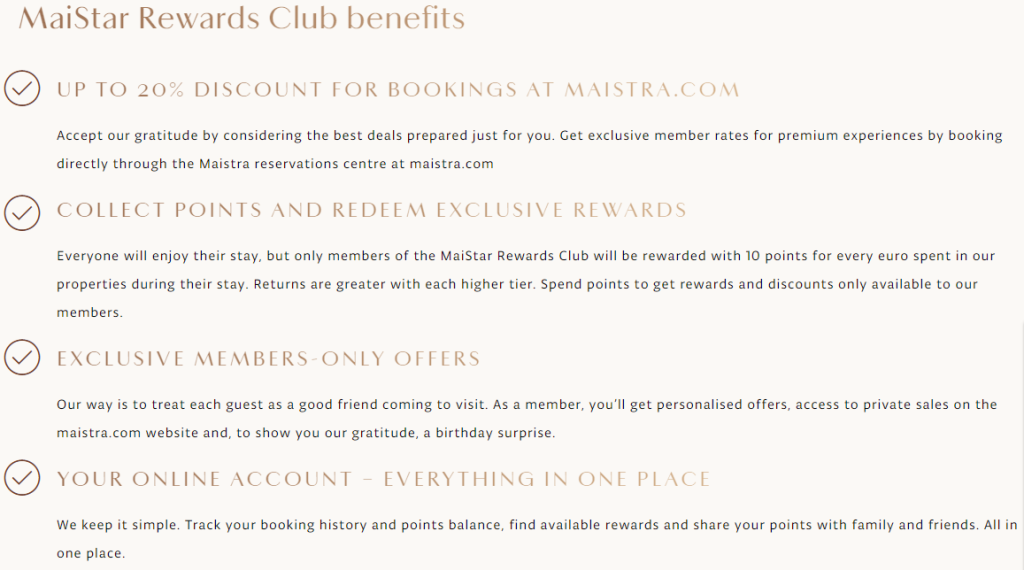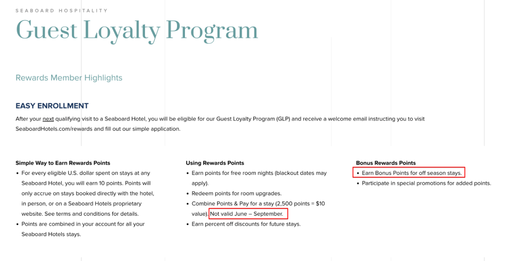 So even if offering discounts on room reservations doesn’t align with your financial strategy, you can still get creative and provide, for example, complimentary room upgrades, spa treatments, or additional points for off-season bookings, as in the example below.
