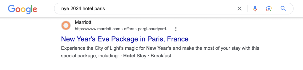 For example, if you’re offering New Year’s celebration packages in your hotel, you could bid for keywords that are related to that, like Marriott in Paris did.