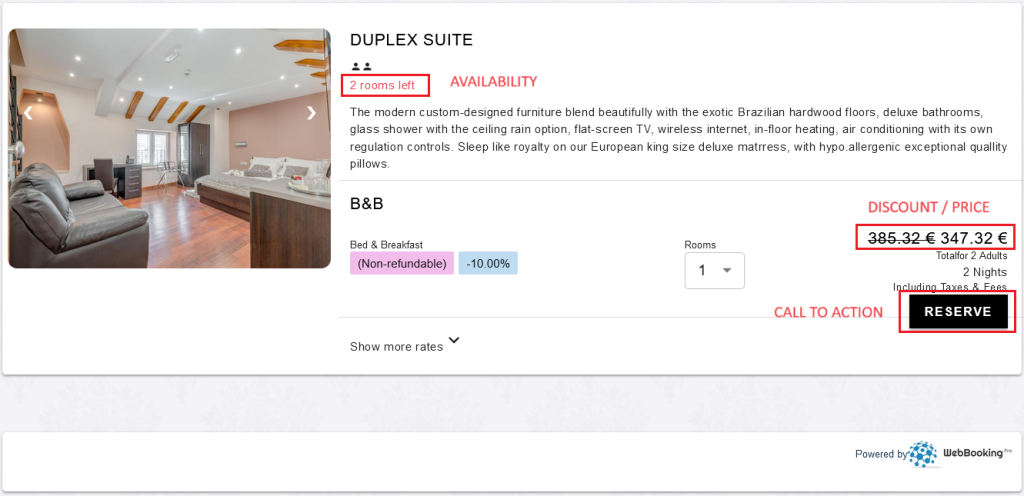 As you can see, guests can check the availability on their preferred dates, check the price, and immediately book a room through an inviting call to action button.