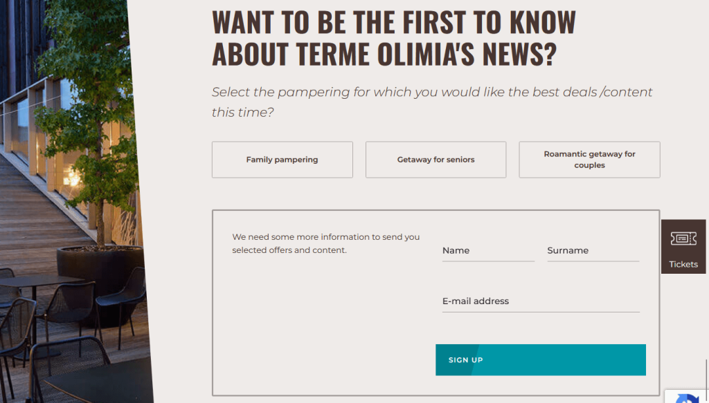 For a simple but effective example of a lead magnet, consider Terme Olimia from Slovenia and its affiliated hotels. They invite potential guests to provide their email addresses on their website to become the first to know about Olimia’s special offers.