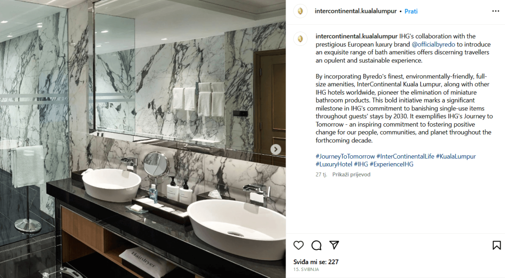 For example, you can start by replacing small plastic shampoo and soap single-use bottles with full-sized ones as InterContinental Kuala Lumpur Hotel did—and show it on social media.