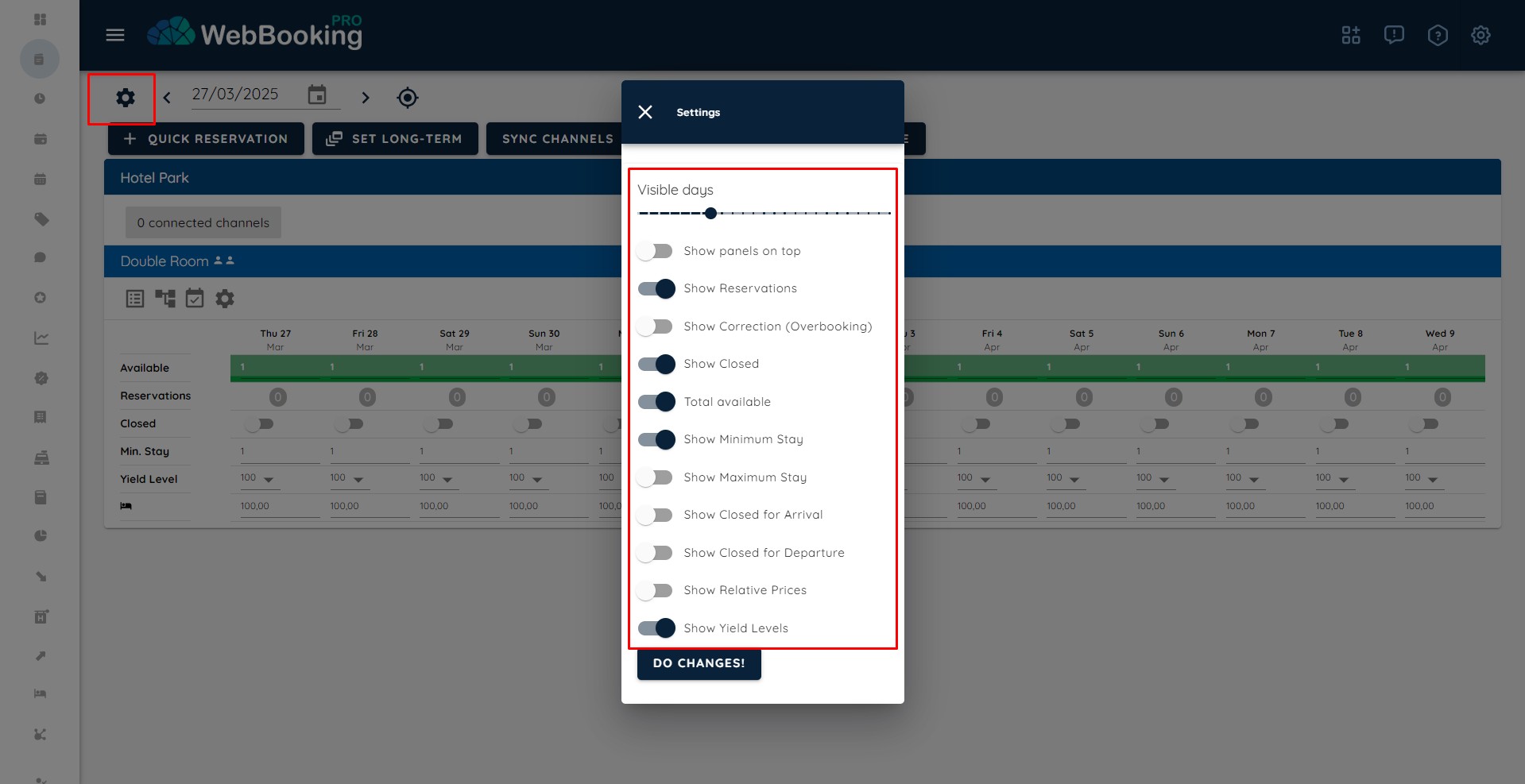 On Cockpit there is another Settings button, left to the start date. Here you can set up preferences about Cockpit (number of visible days – less days visible -> font ih bigger, more days visible -> font is smaller, …).