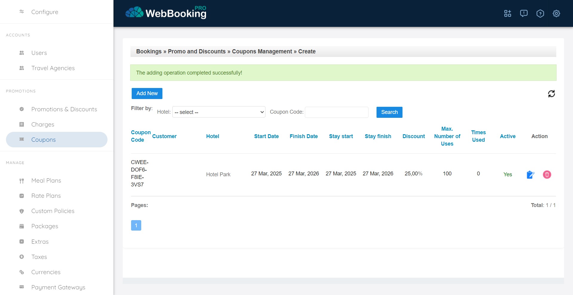 Coupons can have specific Book and Stay periods (From/To), maximum number of uses. Can be linked to specific Rate Ids or Package Ids.