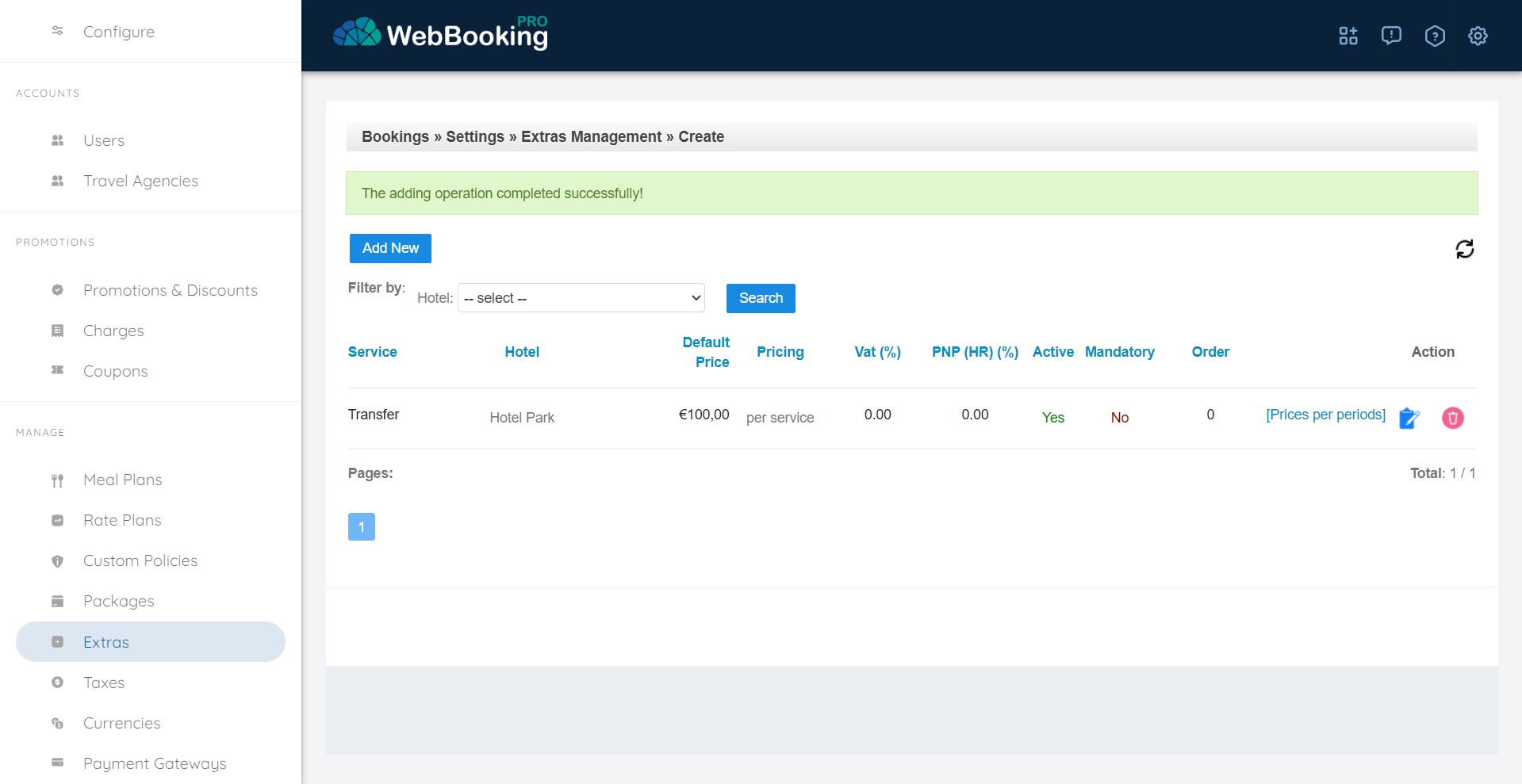 Click on “Add New” button to add New Extra service, or choose Edit or Delete image to modify or delete existing Extra service.