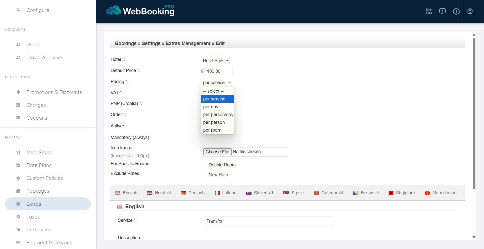 Booking Engine support defining “Extra” serivies that guest can choose on 2nd step of booking – after a Room has been selected.