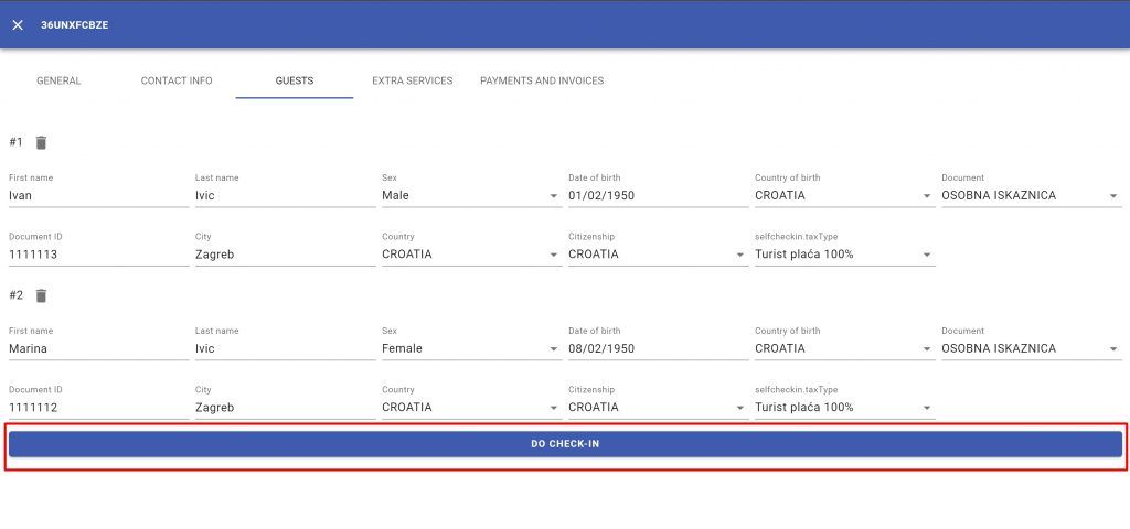 Click on “Do check-in”. You can later modify any of those information and again click on “Do check in” and system will mark those guest to “resend”. If they have been already sent to eVISITOR no duplicate data will be sent – system will update existing data on eVISITOR.