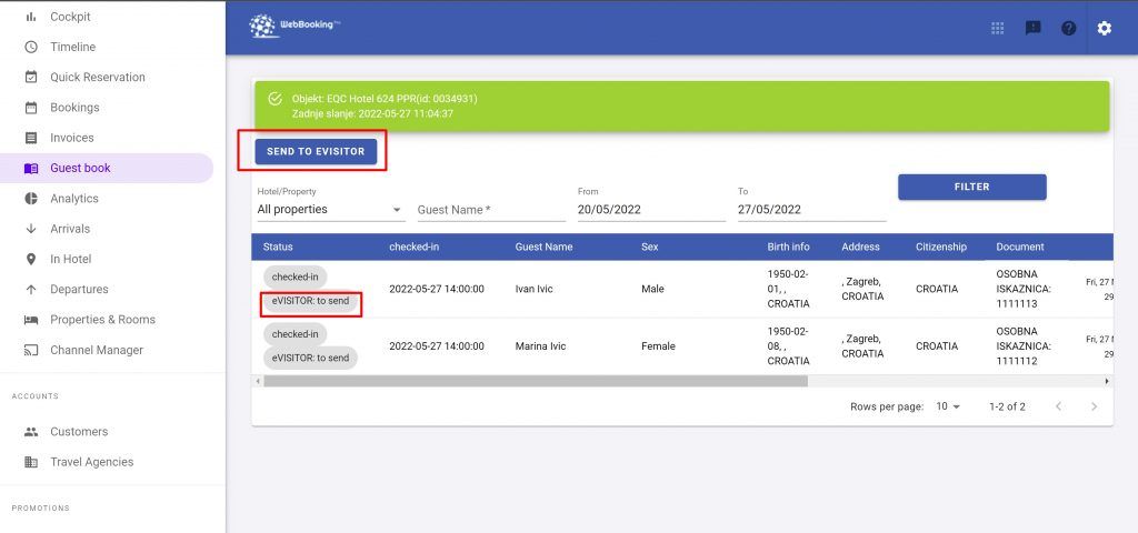 Click on “Send to eVISITOR” button and system will process all data. If everything is OK, green message will come at the top. If something is wrong, red error message will come on top. Please correct data stated in error message and retry sending again to eVISITOR (press button again).