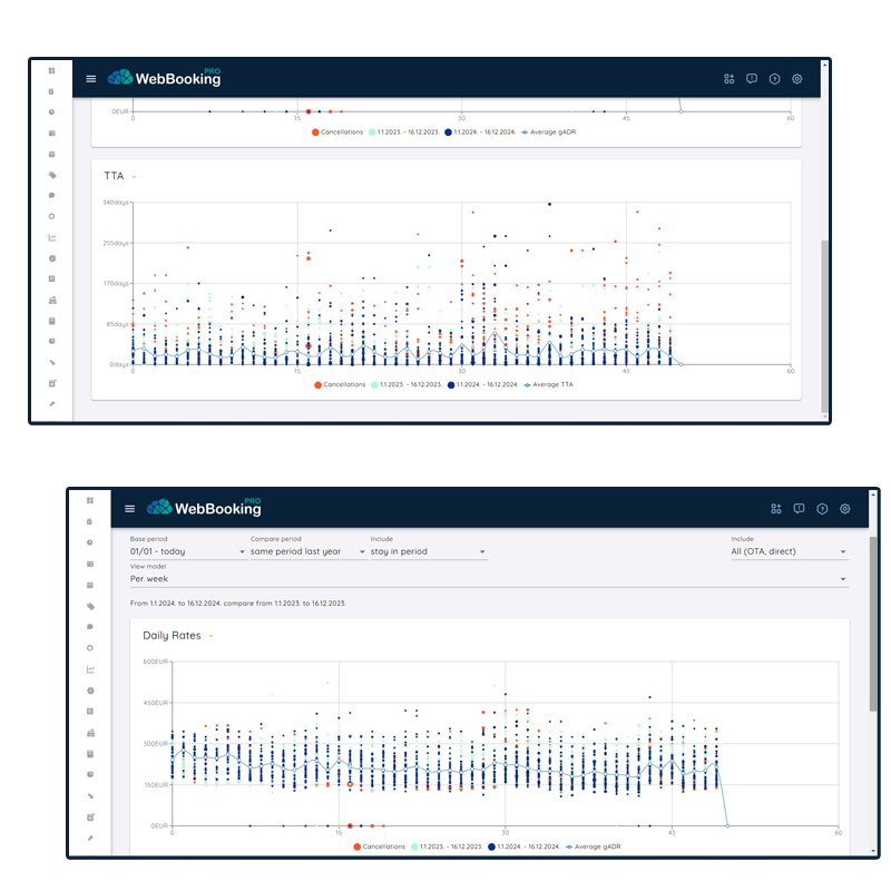 Data Insights to power your business with pricing automation and decision making.You simply define WHEN-THEN scenarios with which you define price corrections (decrease or increase) using numerous parameters. Adjustments can be fixed or proportional to the desired goal. The goals can be analyzed occupancy, analyzed demand, speed of arrival of new reservations and competitors prices for a particular day. In the background, we take care to set your desired goals mathematically in advanced analytical formulas with which WB Pro update prices.
